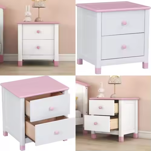 Dual-Drawer Wooden Nightstand White & Pink for Kids & Adults