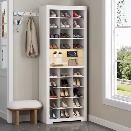 Wooden White 11-Tier Shoe Storage Cabinet with 27 Cubbies and LED Lights