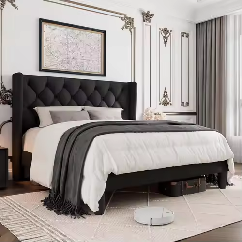 Full Size Upholstered Bed Frame with Button Tufted Headboard & Storage