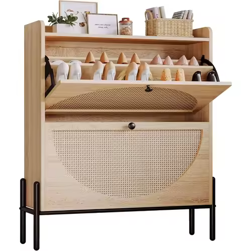 Wooden Shoe Cabinet with 2 Flip Drawers and Rattan Doors